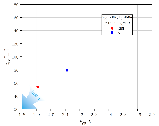 IGBT模塊的飽和壓降VCE sat和開關(guān)損耗ESW是相互制約的因素,但又共同影響著功耗情況。因此,如何根據(jù)應(yīng)用情況權(quán)衡兩者間的關(guān)系,是設(shè)計需要著重關(guān)注的要點之一。下圖所示是中恒微半導(dǎo)體與市場上主流A公司相同封裝模塊的綜合性能對比圖,從開關(guān)損耗和飽和壓降的平衡設(shè)計考慮,中恒微半導(dǎo)體的模塊都占有較大優(yōu)勢。