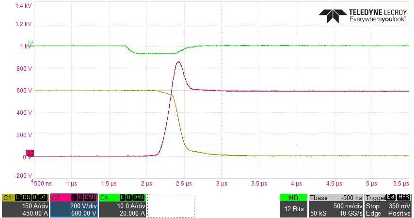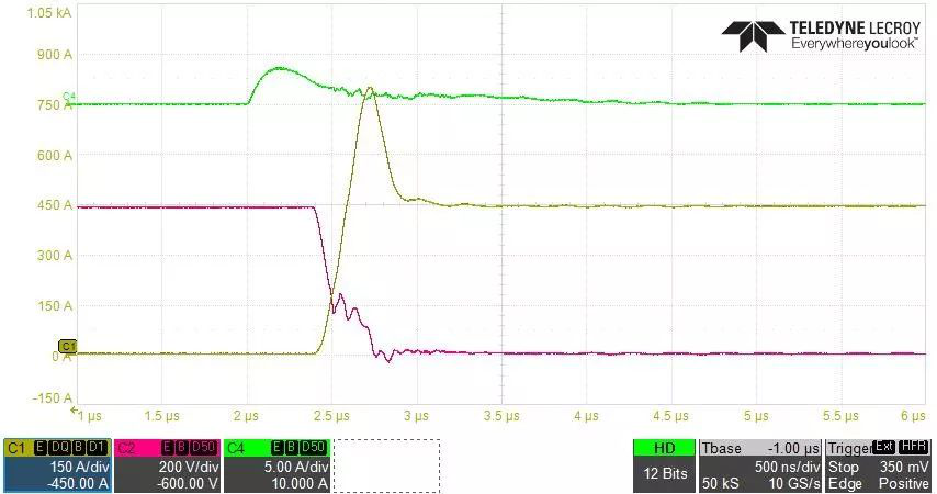 且該封裝模塊具備良好的開關(guān)特性,如圖3所示,開關(guān)損耗對比市場主流產(chǎn)品,功耗降低了約10%。并且在1Ω的驅(qū)動電阻下,峰值參數(shù)仍處于安全工作范圍,確保了產(chǎn)品的可靠性。有效控制開關(guān)噪聲的同時提高了開關(guān)速度,有助于降低終端用戶機體散熱結(jié)構(gòu)、驅(qū)動電路及控制程序的設(shè)計難度。