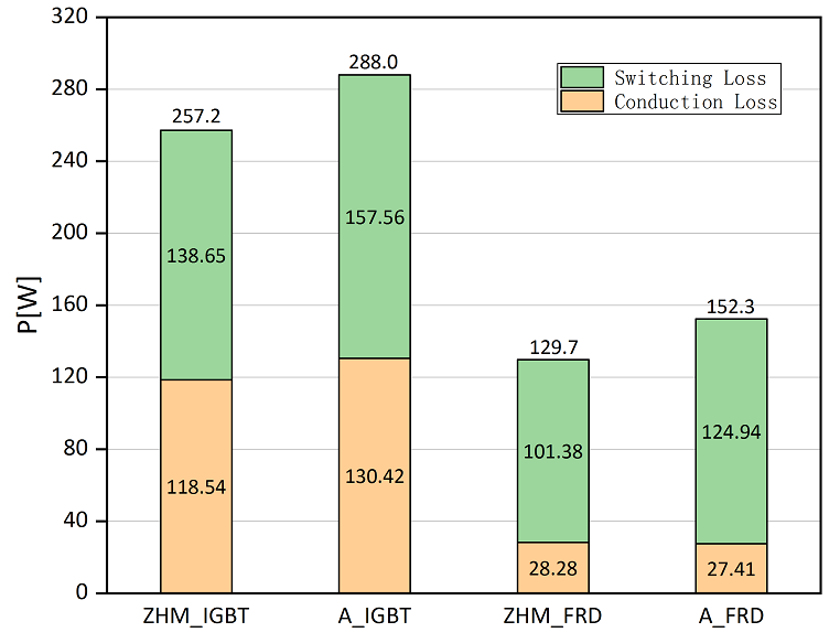 研究表明,IGBT器件的結(jié)溫每升高10℃,失效率就會增加一倍,并且絕大多數(shù)器件失效都是由于工作結(jié)溫過高導(dǎo)致的。因此,控制功率模塊的工作結(jié)溫是設(shè)計中需要重點考慮的又一因素。示例模塊的計算結(jié)果表明,在母線電壓600V,導(dǎo)通電流225A,頻率10kHz的半載工況下,示例模塊的耗散功率遠低于市場上A公司的產(chǎn)品,如圖4所示。